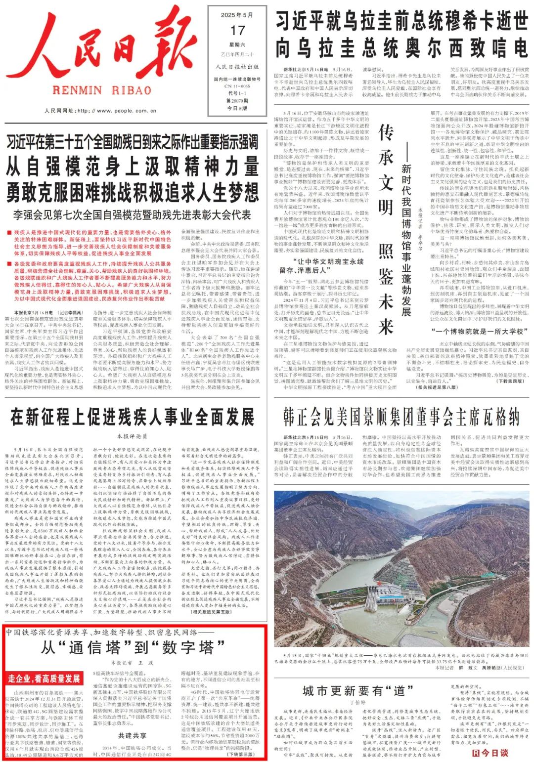 5月17日,世界電信和信息社會(huì)日當(dāng)天,人民日?qǐng)?bào)頭版刊發(fā)“走企業(yè),看高質(zhì)量發(fā)展”專題報(bào)道,題為《中國(guó)鐵塔深化資源共享、加速數(shù)字轉(zhuǎn)型、織密惠民網(wǎng)絡(luò)——從“通信塔”到“數(shù)字塔”》,全文2328字,從通信鐵塔共建共享、轉(zhuǎn)型升級(jí)、民生之責(zé)三個(gè)層面,生動(dòng)講述了從“通信塔”到“數(shù)字塔”蝶變,更好服務(wù)國(guó)計(jì)民生的故事,全文如下: